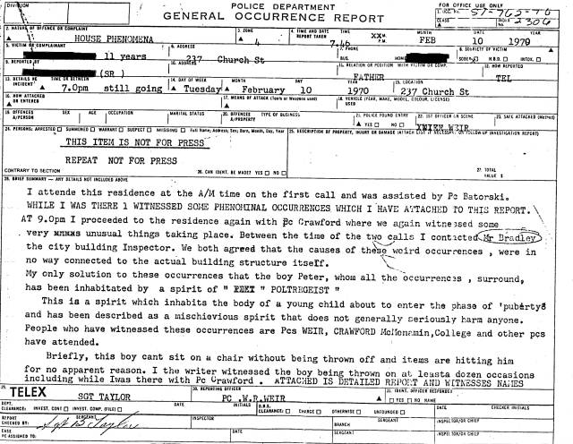 Based on the information given by the three distinguished members of the Niagara Regional Police Force that I interviewed, Bob Crawford, Bill Weir and Mike McMenanin, who have a combined total of more than 75 years police experience, that it this a very rare case of a highly documented poltergeist.